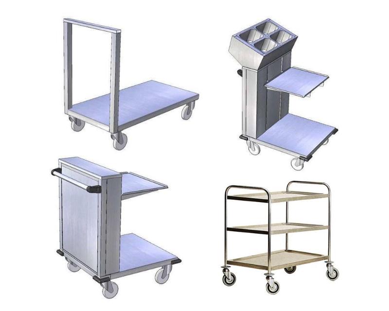 Obrázok: hore vľavo dopravný vozík s jednou policou, vpravo hore vozík na tácky a príbory polohovateľný, vľavo dole vozík na podnosy polohovateľný, vľavo dole servírovací vozík trojpolicový